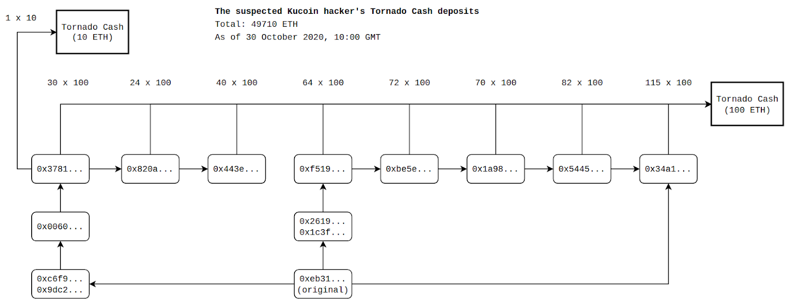 On 26 September 2020, a hacker moved large amounts of ETH, ERC20 tokens, and other cryptocurrencies of Kucoin’s hot wallets. Subsequently, the hacker swapped many ERC20 tokens for ETH using Uniswap and deposited the ETH into Tornado Cash’s 100 ETH and 10 ETH contracts.